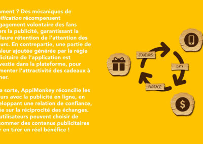 AppiMonkey crée une nouvelle relation de confiance entre les annonceurs et l’utilisateur. Ce dernier est replacé au cœur de la relation commerciale, considéré dès lors comme un partenaire et non plus comme un produit. Aussi ludique que lucrative, l’application permet ainsi de réconcilier les marques et les internautes avec la publicité digitale en valorisant leurs interactions.